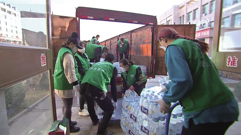 青年志愿者為支援疫情防控前線搬運(yùn)物資。