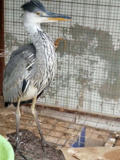 經(jīng)有經(jīng)驗的民警辨認(rèn),這是一只蒼鷺幼鳥。這只鳥身高約70公分,長長的尖嘴,身著灰色體羽,頭戴深灰色羽冠,兩條大長腿格外顯眼,白色的前頸縱向排列著黑灰色條紋。民警聯(lián)系獸醫(yī)為其做了體檢,經(jīng)檢查,這只鳥并無傷病,可能是由于剛出窩飛行能力不強、捕食能力不足,造成體力虛弱。民警買來小魚,只見這只鳥狼吞虎咽享用起來,不久便精神十足,開始啄民警??吹剿w力開始恢復(fù),民警懸著的心也就放下了。民警計劃選擇合適時間和地方將其放飛。