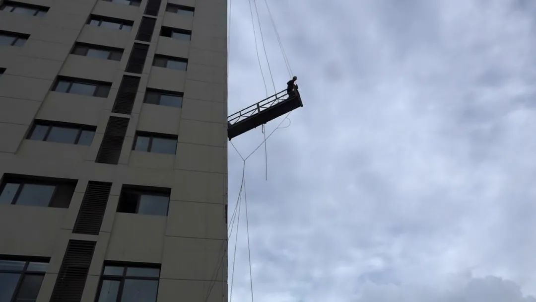 17時16分,包頭市消防救援支隊健康路消防站接到指揮中心派警后,立即出動2輛消防車、10名消防隊員火速趕到現(xiàn)場。消防隊員觀察發(fā)現(xiàn),一名負責粉刷大樓外墻的工人被困在公寓外7-8樓之間吊籃中,大顆大顆的冰雹打在他身上,升降機器鋼絲繩在風雨中被纏繞在一起,吊籃無法升降。由于天氣惡劣,風速很大,情況十分危險。