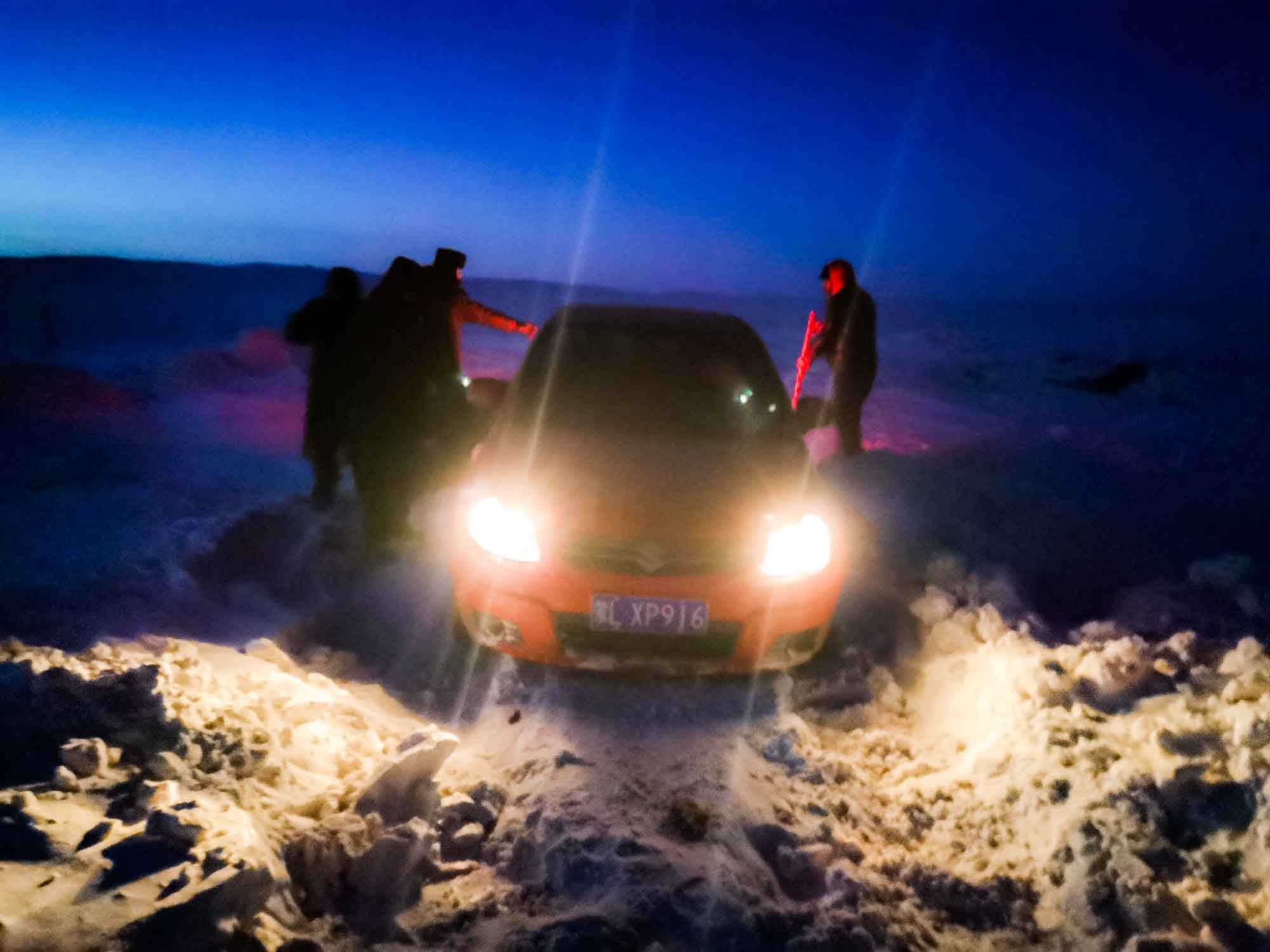 1月17日17時(shí),那木吉拉與弟弟一同駕車返回百靈廟鎮(zhèn),在途經(jīng)一處被風(fēng)谷地時(shí),由于晚上視線較差,且此處坡度較大,不慎陷入雪中無法動(dòng)彈,只得撥通電話請(qǐng)求派出所救助。草原上沒有遮蔽物,常常到了下午就刮起大風(fēng),吹得積雪覆蓋在土地上分不清地勢(shì)高低,民警們按著平日下鄉(xiāng)走訪的經(jīng)驗(yàn)摸索前進(jìn),經(jīng)過近一小時(shí)才到達(dá)現(xiàn)場(chǎng),了解情況后,民警們將準(zhǔn)備好的熱水和棉大衣遞給牧民便展開了救援工作。在零下35度的冬夜里,民警們用鐵鍬和雙手經(jīng)過近兩個(gè)小時(shí)的奮戰(zhàn)終于將40厘米厚的積雪清理干凈,并將被困車輛通過前拉后推的方式移至平坦區(qū)域。