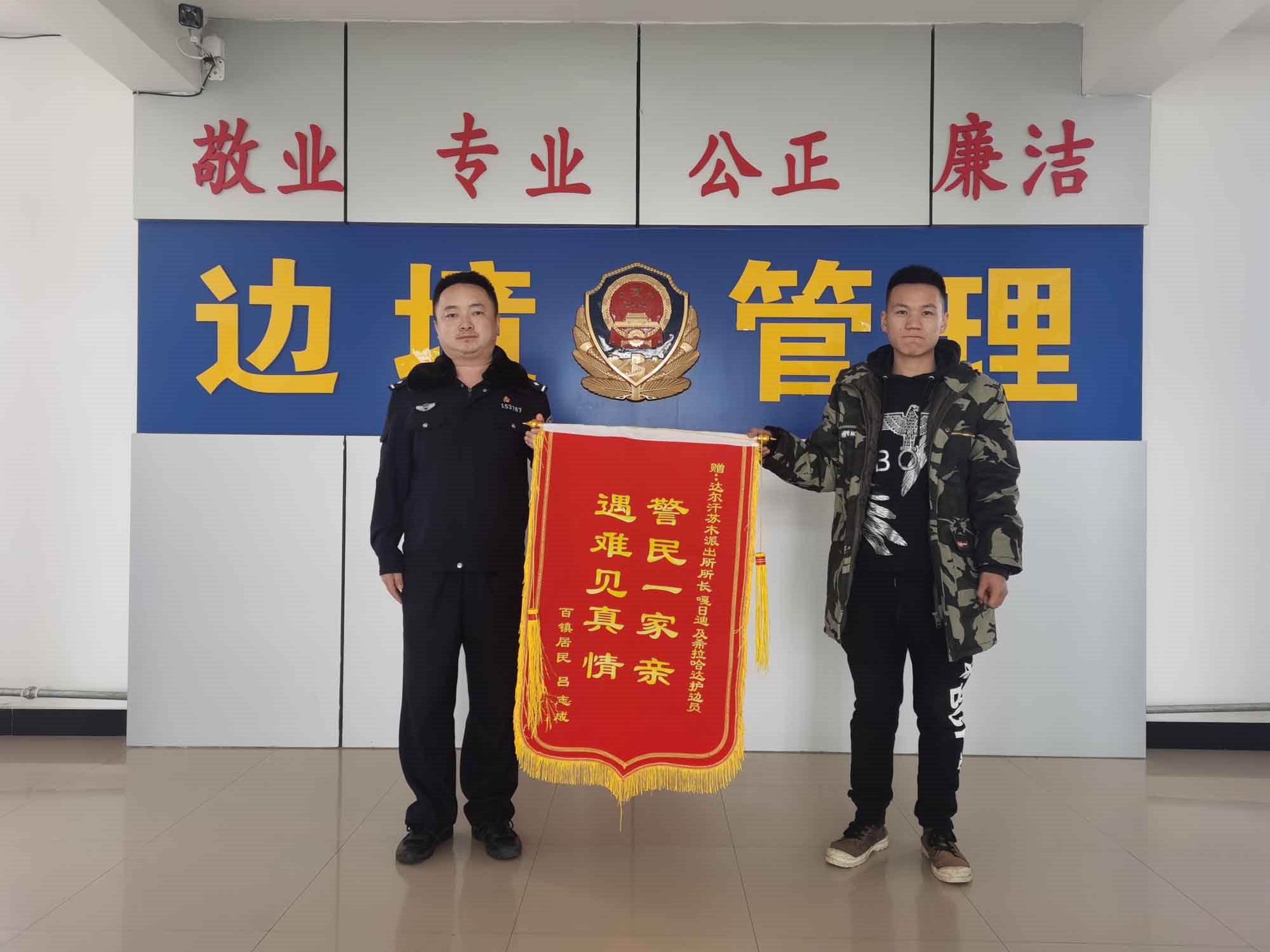 “民警同志太感謝你們了,有你們?cè)谖覀兙透杏X安心多了?!?月19日早晨,內(nèi)蒙古包頭市達(dá)茂旗達(dá)爾罕蘇木牧民那木吉拉“嘎吱嘎吱”的踩著潔白的積雪走進(jìn)包頭邊境管理支隊(duì)達(dá)爾罕邊境派出所,一邊說著一邊拿出印有“警民一家親,遇難見真情”的錦旗遞給民警。