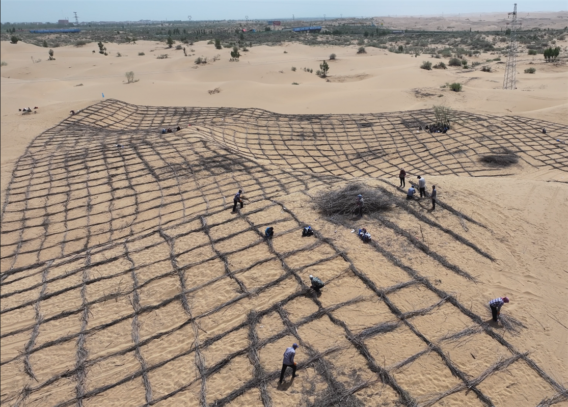 在鄂爾多斯市庫布其沙漠S215穿沙公路沙化土地綜合治理項目現(xiàn)場,工人正在鋪設(shè)沙障。(資料圖)