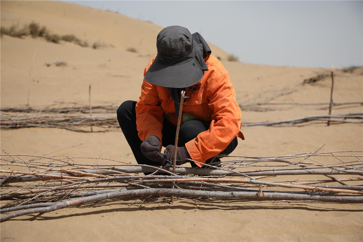 在鄂爾多斯市庫布其沙漠S215穿沙公路沙化土地綜合治理項目現(xiàn)場,工人正在固定沙障。(資料圖)