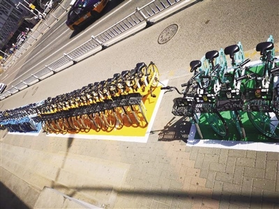 7月23日上午,記者來(lái)到呼和浩特火車站門(mén)前,遠(yuǎn)遠(yuǎn)就被火車站東側(cè)馬路道牙上的多彩顏色所吸引。原來(lái)這里被畫(huà)上了藍(lán)色、綠色和黃色的停車區(qū)域,一排排各品牌共享單車也根據(jù)車身顏色有序停放著。
