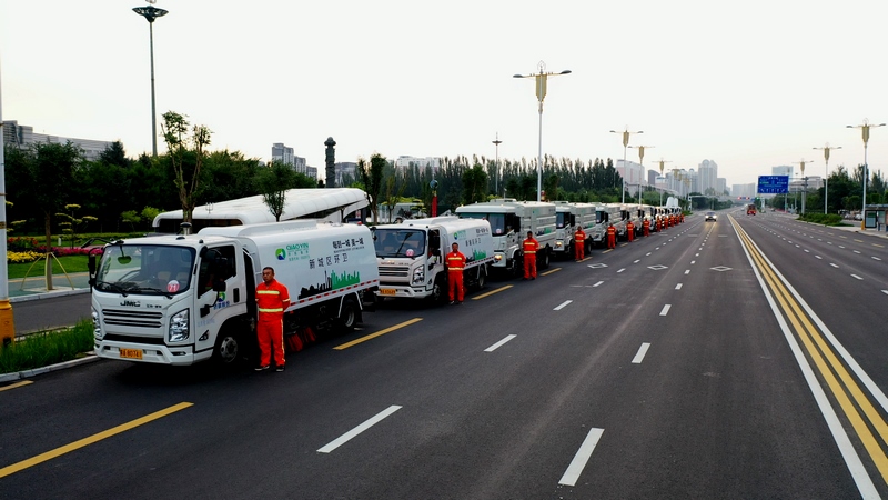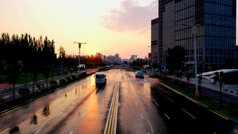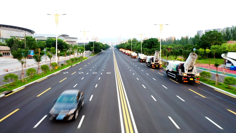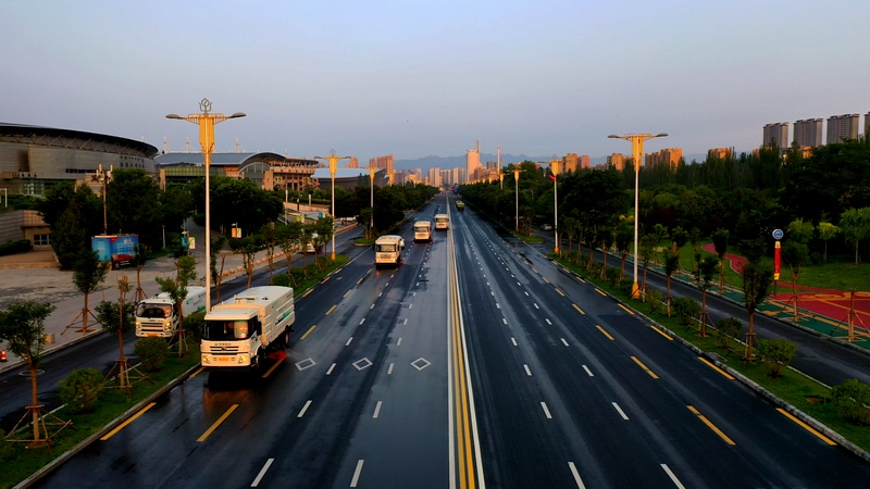 當(dāng)東方微微發(fā)白,高壓沖洗車強(qiáng)力開路,將道路上的廢棄物、積灰沖到道路兩側(cè)。