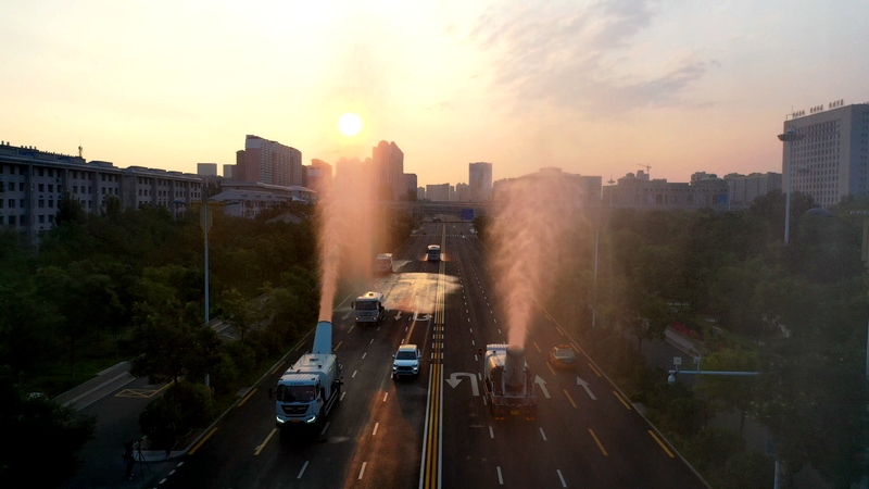 凌晨6點(diǎn),晨曦初露,朝霞輕染,被稱作“高霧炮”的多功能抑塵車和高壓水車開始霸氣地聯(lián)合作業(yè),一道道水霧騰空而起或四散鋪開,清潔降塵,提高空氣濕度。