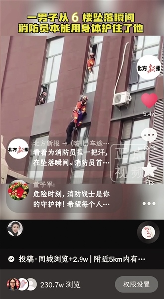 6月25日12時10分,呼和浩特市彩虹城發(fā)生驚險一幕:一男子欲跳樓輕生,墜落瞬間,一名消防員飛身拽住了他,本能地用身體將其牢牢護(hù)在懷中,最終,該男子成功獲救。救援的這一幕被熱心市民朱先生用手機(jī)記錄下來并發(fā)布到網(wǎng)上,瞬間引來各地網(wǎng)友圍觀。本報官方抖音賬號也發(fā)布了這則視頻,播放量突破230萬,點贊5.4萬。