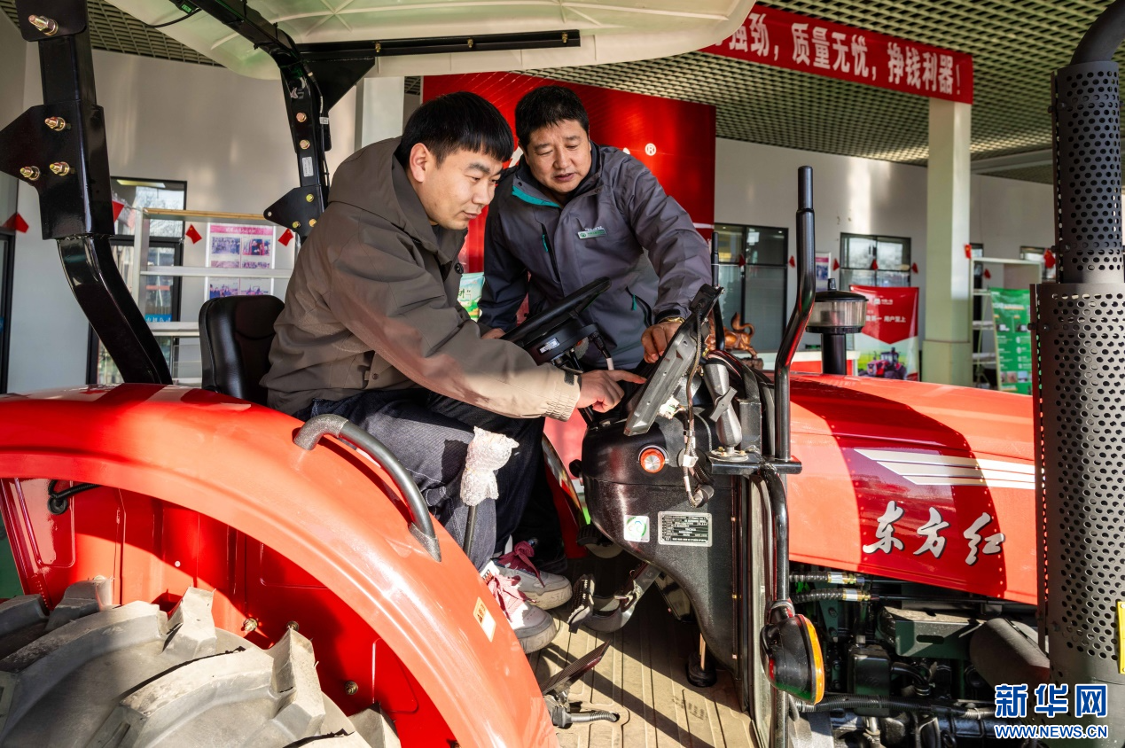 ??2月18日,在位于呼和浩特市玉泉區(qū)的一家農(nóng)機設(shè)備公司展銷大廳,農(nóng)戶在試駕拖拉機。新華網(wǎng)發(fā)(丁根厚 攝)