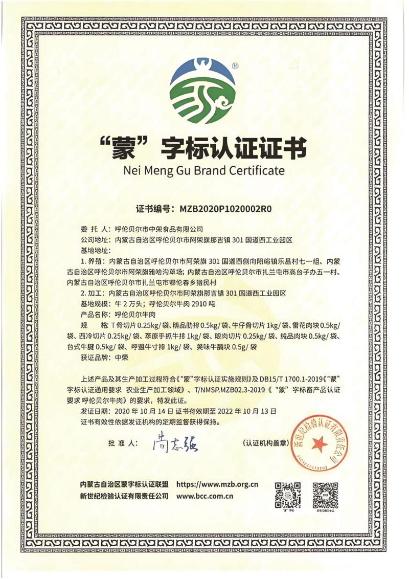 呼倫貝爾市中榮食品有限公司“蒙”字標(biāo)認(rèn)證證書(shū)