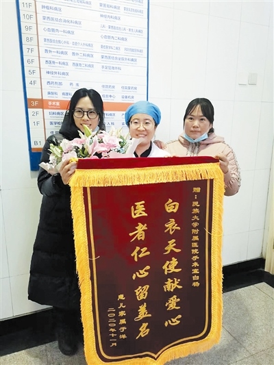 11月27日,當孩子已經(jīng)好轉(zhuǎn)出院,王欣影沒有忘記那一夜遇到的好心人,她再一次撥通白楊的電話,此時,她才得知白楊就是附屬醫(yī)院手術(shù)室的一名護士。她將一面寫有“白衣天使獻愛心醫(yī)者仁心留美名”的錦旗送到了白楊的手中,她說:女兒又多了一位媽媽。白楊也向記者講起了那晚的經(jīng)歷,她說:“其實,那晚我是去接我丈夫的,由于暴雪,丈夫被困在了米家科技園附近,我開車去接他,在回來的路上,看到有車輛遇險,心想,這樣惡劣的天氣,遇到誰有困難就應該幫一把,當時,我們也沒有多想,我也是做母親的,看到夫妻倆那么焦急,我只想把孩子快點送到醫(yī)院,好在有驚無險,孩子平安無事?!焙髞?,記者還了解到,當把孩子送到醫(yī)院后,白楊已渾身濕透,待孩子已經(jīng)搶救上,安頓好王欣影后,已經(jīng)是凌晨5點,天也蒙蒙亮了,白楊沒有回家,一夜未眠的她,留在了工作崗位上。