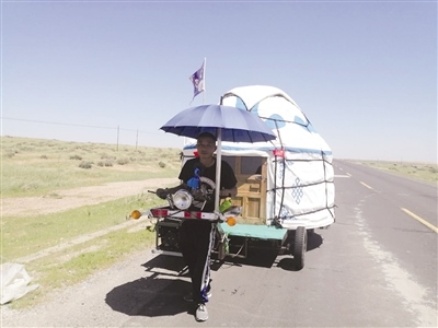 7月31日中午,記者途經(jīng)209國道錫林郭勒盟蘇尼特左旗路段時,看到一位黢黑健壯的漢子拉著車走在公路上,兩輪車上有一座小型的蒙古包。記者下車和他攀談起來,原來這個漢子的心中有個為期兩年的“英雄夢”。