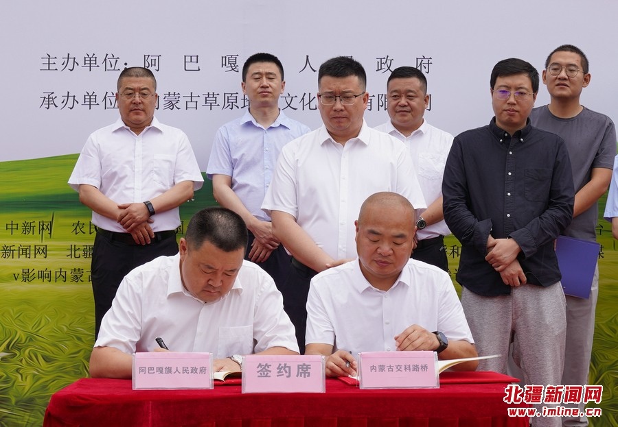 推介會現(xiàn)場,阿巴嘎旗人民政府副旗長李軍分別與內(nèi)蒙古交科路橋建設有限公司黨委書記、董事長鈕英才,內(nèi)蒙古草原地圖文化傳播有限公司負責人王國柱簽訂戰(zhàn)略合作協(xié)議。