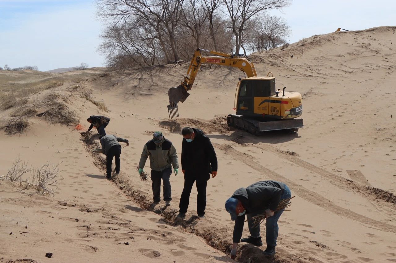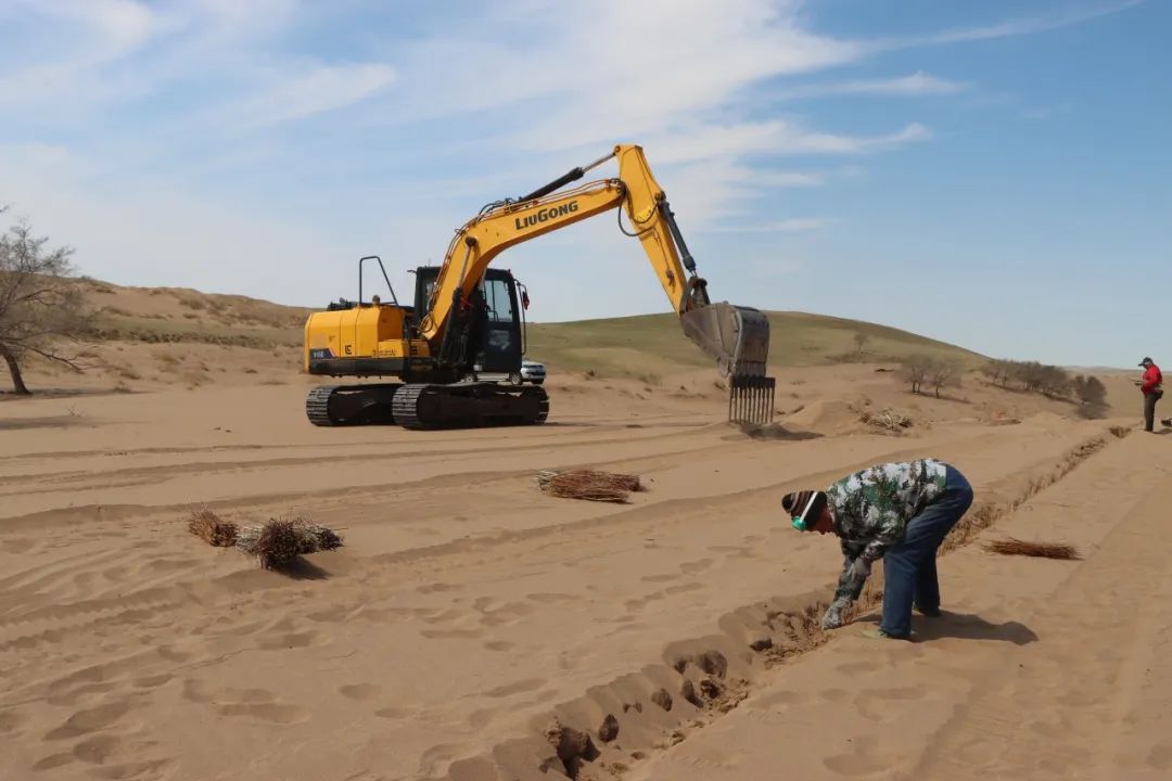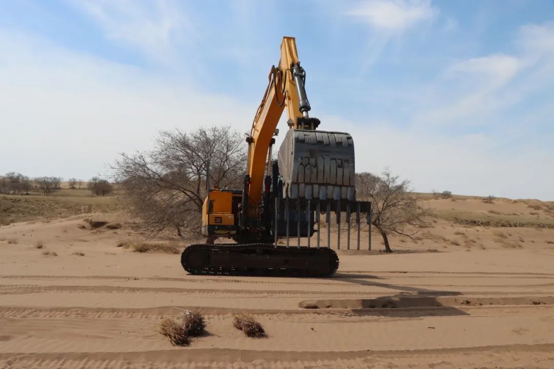 據(jù)錫林浩特市二蛋牧民養(yǎng)殖專業(yè)合作社負(fù)責(zé)人介紹,在傳統(tǒng)的沙漠治理作業(yè)中,工人需要手動栽植黃柳等固沙植物。然而,人工種植不僅效率低,勞動強(qiáng)度也大。為突破這一困境,合作社成員經(jīng)過多次試驗,最終決定對挖掘機(jī)進(jìn)行創(chuàng)新改造,加裝叉具,這一巧妙的設(shè)計不僅實現(xiàn)了對黃柳種植深度和間距的精準(zhǔn)把控,還能有效避免土壤翻動,最大程度地保持了土壤水分,切實保護(hù)了沙地的生態(tài)環(huán)境。