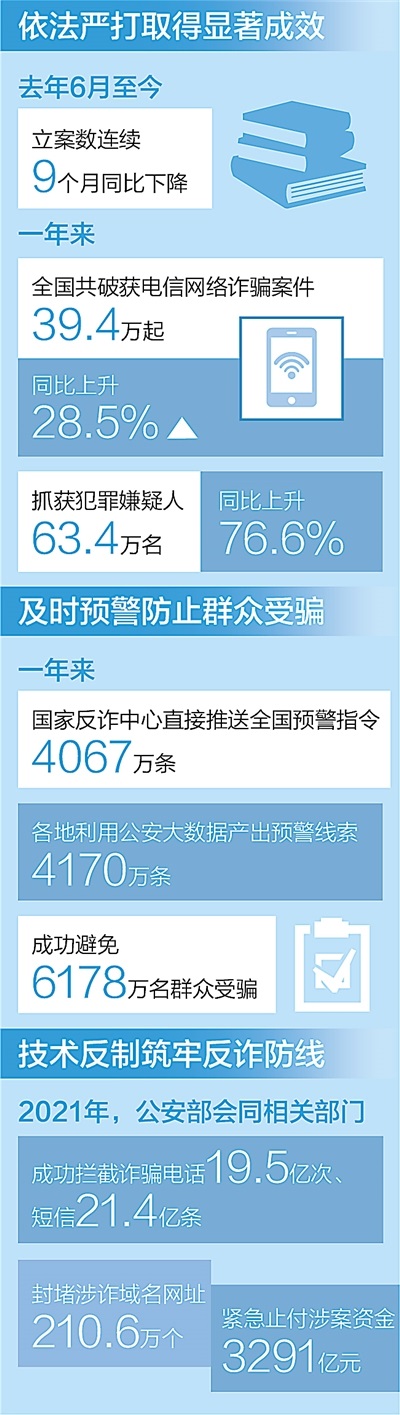 “工信部升級(jí)啟動(dòng)‘?dāng)嗫ㄐ袆?dòng)2.0’,組織集中排查處置涉詐高風(fēng)險(xiǎn)電話卡9700多萬張,清理關(guān)聯(lián)互聯(lián)網(wǎng)賬號(hào)5700萬余個(gè),對(duì)全國(guó)物聯(lián)網(wǎng)卡開展拉網(wǎng)式排查,一大批存量高危號(hào)卡得到全面清理。”工信部網(wǎng)絡(luò)安全管理局局長(zhǎng)隋靜介紹,2021年,工信部依法處置涉詐碼號(hào)4.5萬個(gè)、域名網(wǎng)址104萬個(gè),攔截涉詐電話19.5億次、涉詐短信21.4億條,部署推進(jìn)“打貓(池)行動(dòng)”,大力清理詐騙作案工具。