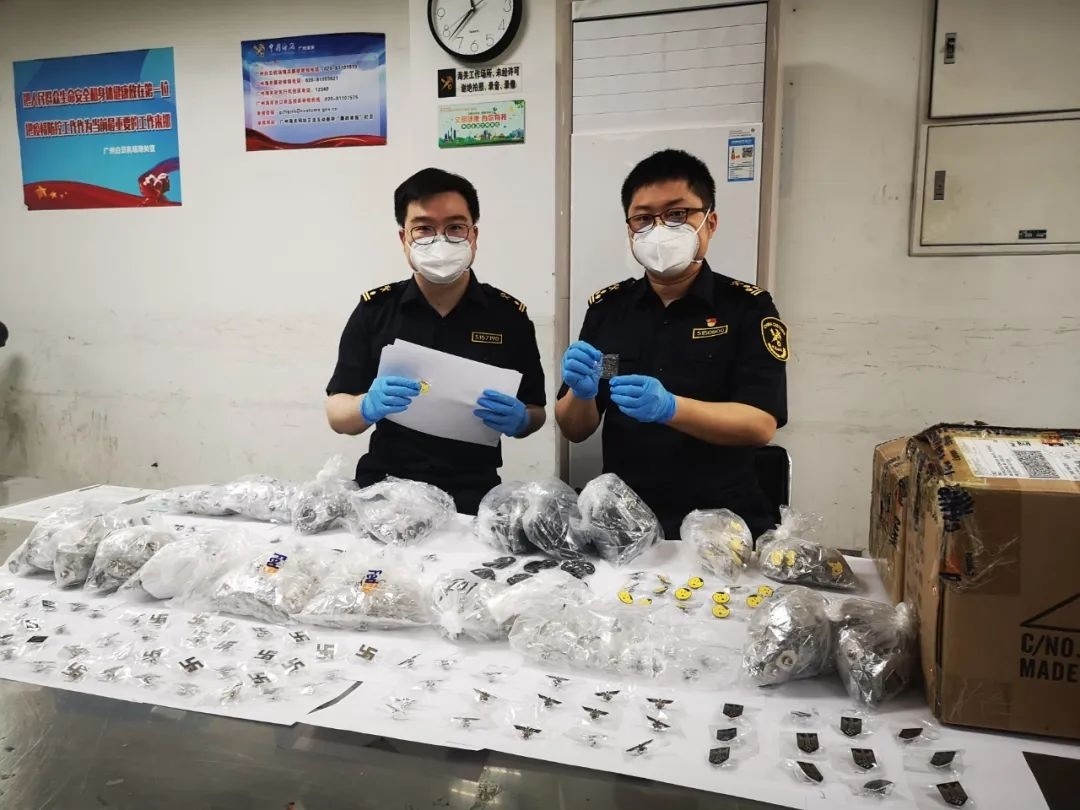 記者5月12日從廣州海關獲悉,該關近日在廣州白云機場空港口岸出境快件渠道查獲一批納粹徽章,共9個品種、1881枚。目前,已作進一步處理。