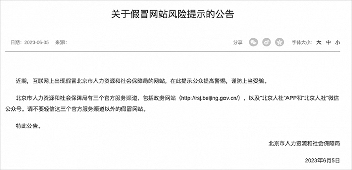 ·北京人社局就近期出現(xiàn)假冒網(wǎng)站發(fā)布風險提示。
