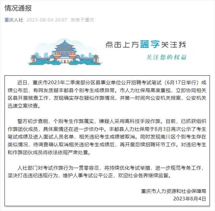 ·重慶通報事業(yè)單位招考作弊案:嫌疑人用高科技手段團伙作弊,已抓獲組織作弊團伙成員。