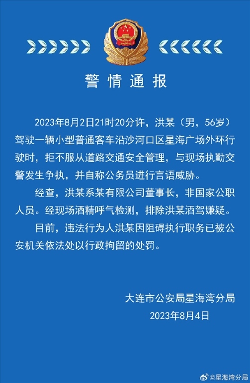 ·大連警方通報男子自稱公務(wù)員威脅交警:非公職人員,已行拘。