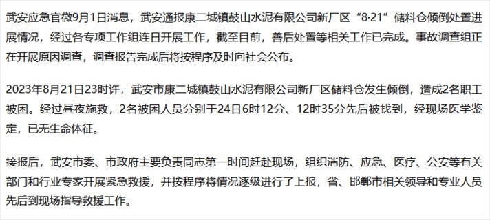 ·河北武安:一水泥廠儲(chǔ)料倉發(fā)生傾倒致兩人死亡。