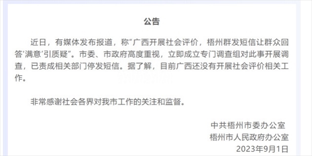 ·網(wǎng)傳廣西開展社會(huì)評(píng)價(jià),梧州群發(fā)短信讓群眾回答“滿意”,梧州市政府:開展調(diào)查,已責(zé)成相關(guān)部門停發(fā)短信。據(jù)了解廣西還未開展社會(huì)評(píng)價(jià)相關(guān)工作。