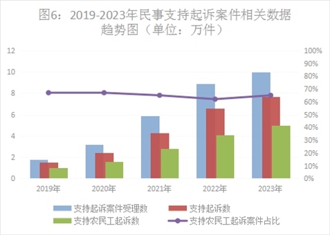 一是民事支持起訴數(shù)量上升較快。2023年,全國檢察機關共受理民事支持起訴案件10.14萬件,同比上升13.9%,審查后支持起訴7.73萬件,其中支持農(nóng)民工起訴5.08萬件。從案件類型上看,主要以勞動爭議(占43.9%)、合同糾紛(占33%)、婚姻家庭糾紛(占6.7%)為主。