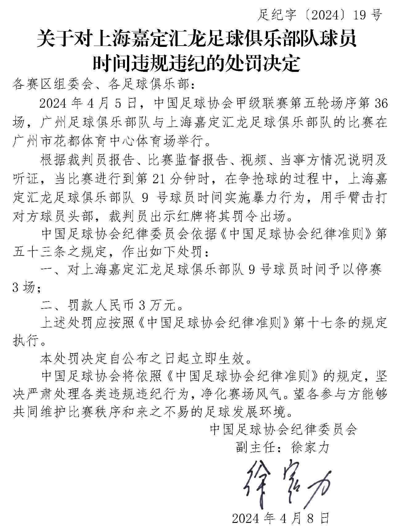 央視網(wǎng)消息:4月10日,中國足協(xié)網(wǎng)站發(fā)布《關(guān)于對(duì)上海嘉定匯龍足球俱樂部隊(duì)球員時(shí)間違規(guī)違紀(jì)的處罰決定》《關(guān)于對(duì)西安崇德榮海足球俱樂部隊(duì)違規(guī)違紀(jì)的處罰決定》《關(guān)于對(duì)大連鯤城足球俱樂部隊(duì)違規(guī)違紀(jì)的處罰決定》三份處罰決定。中甲聯(lián)賽上海嘉定匯龍9號(hào)球員因暴力行為被停賽罰款。中乙聯(lián)賽大連鯤城與西安崇德榮海兩家俱樂部因未按規(guī)定指派特定官員參加賽前聯(lián)席會(huì),被通報(bào)批評(píng)。