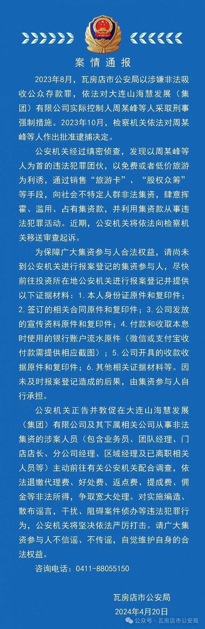 央視網(wǎng)消息:據(jù)瓦房店市公安局官微消息,遼寧瓦房店市公安局通報(bào),2023年8月,瓦房店市公安局以涉嫌非法吸收公眾存款罪,依法對(duì)大連山?;郯l(fā)展(集團(tuán))有限公司實(shí)際控制人周某峰等人采取刑事強(qiáng)制措施。2023年10月,檢察機(jī)關(guān)依法對(duì)周某峰等人作出批準(zhǔn)逮捕決定。公安機(jī)關(guān)經(jīng)過縝密偵查,發(fā)現(xiàn)以周某峰等人為首的違法犯罪團(tuán)伙,以免費(fèi)或者低價(jià)旅游為利誘,通過銷售“旅游卡”、“股權(quán)眾籌”等手段,向社會(huì)不特定人群非法集資,肆意揮霍、濫用、占有集資款,并利用集資款從事違法犯罪活動(dòng)。近期,公安機(jī)關(guān)將依法向檢察機(jī)關(guān)移送審查起訴。