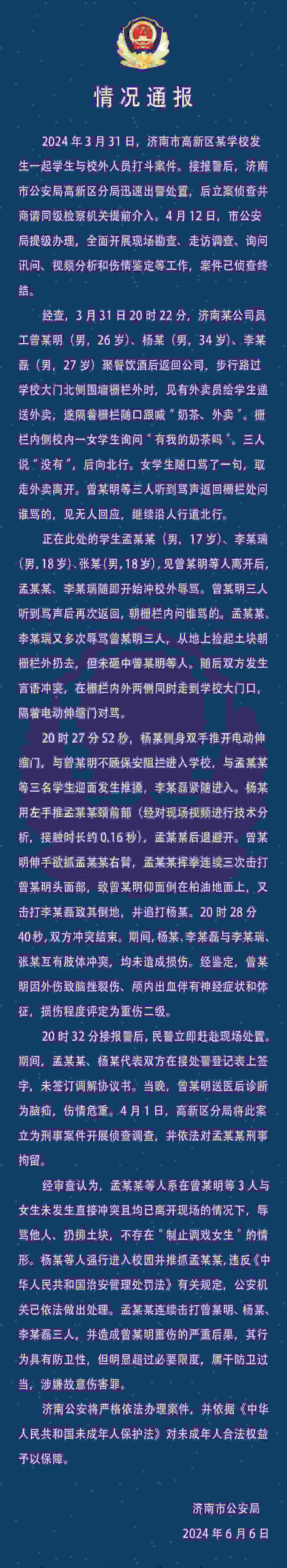 學(xué)生與醉漢沖突、被拘留 濟(jì)南警方:涉事學(xué)生屬于防衛(wèi)過(guò)當(dāng)