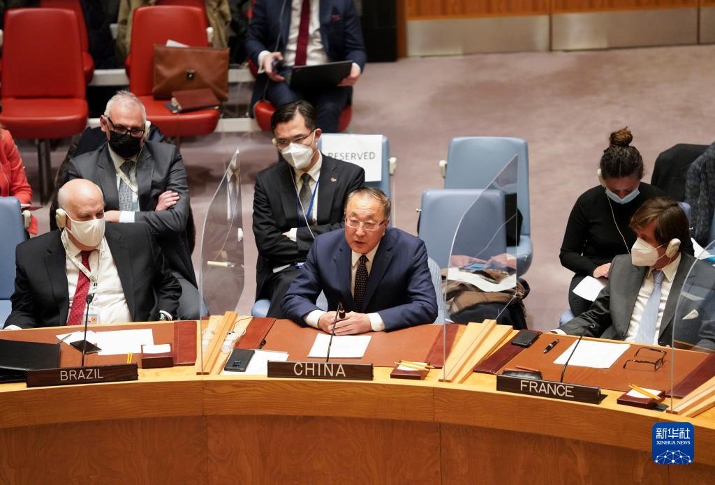 2月21日,在位于紐約的聯(lián)合國(guó)總部,中國(guó)常駐聯(lián)合國(guó)代表張軍(前中)在安理會(huì)舉行的審議烏克蘭問(wèn)題緊急會(huì)議上發(fā)言。新華社記者 王迎 攝