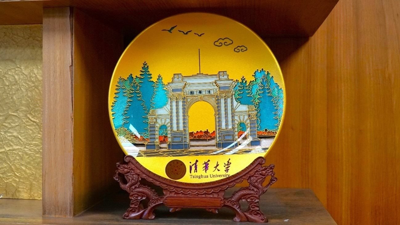 擺放在會議室的清華大學(xué)紀(jì)念盤。人民網(wǎng)視頻截圖