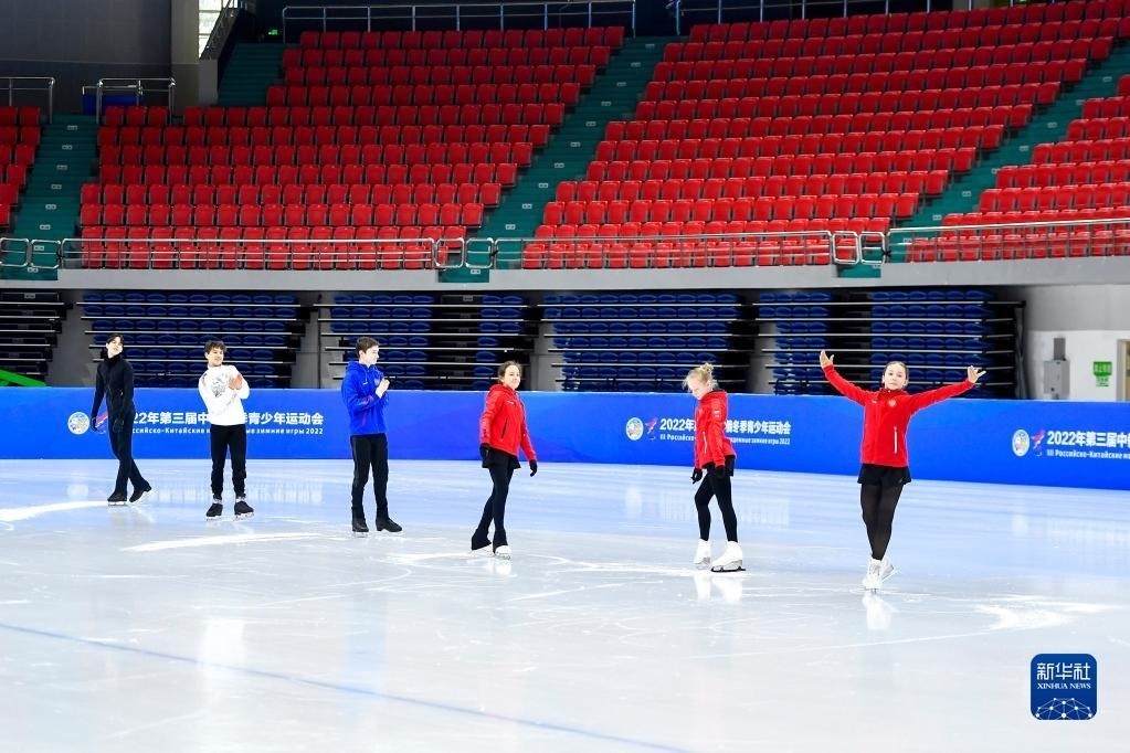 在長春五環(huán)體育館,參加第三屆中俄冬季青少年運動會的俄羅斯花樣滑冰運動員在賽前場地適應(yīng)性訓(xùn)練時向場邊的中國運動員致意(2022年12月15日攝)。新華社記者 許暢 攝