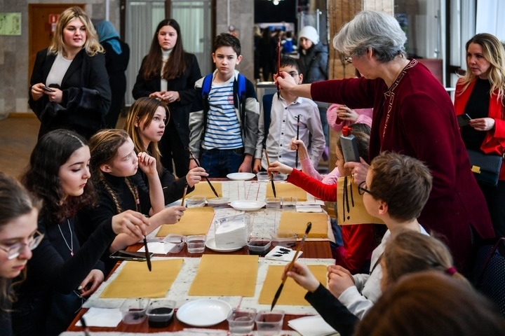 3月3日,在莫斯科國際關(guān)系學院,小朋友們在中國文化體驗活動上學習使用毛筆。新華社記者曹陽攝