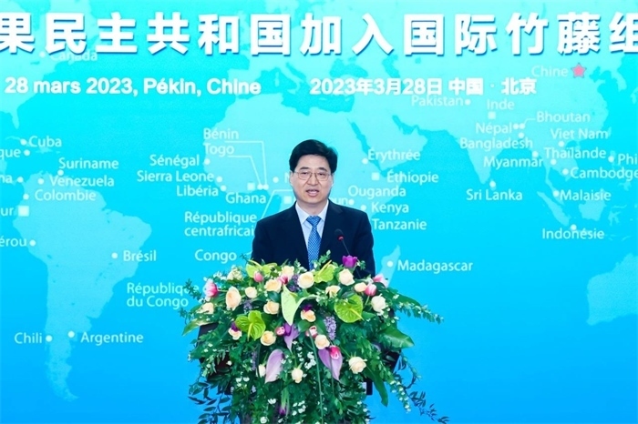 國際竹藤組織理事會(huì)主席、喀麥隆林業(yè)和野生動(dòng)物部部長恩東戈·朱爾·多雷,國際竹藤組織董事會(huì)聯(lián)合主席江澤慧,中國外交部國際經(jīng)濟(jì)司參贊張雷,中國國家林業(yè)和草原局副局長譚光明,乍得共和國駐華使館代辦馬魯米,剛果民主共和國農(nóng)業(yè)部部長姆津加·比利漢澤·德西雷出席并致辭。