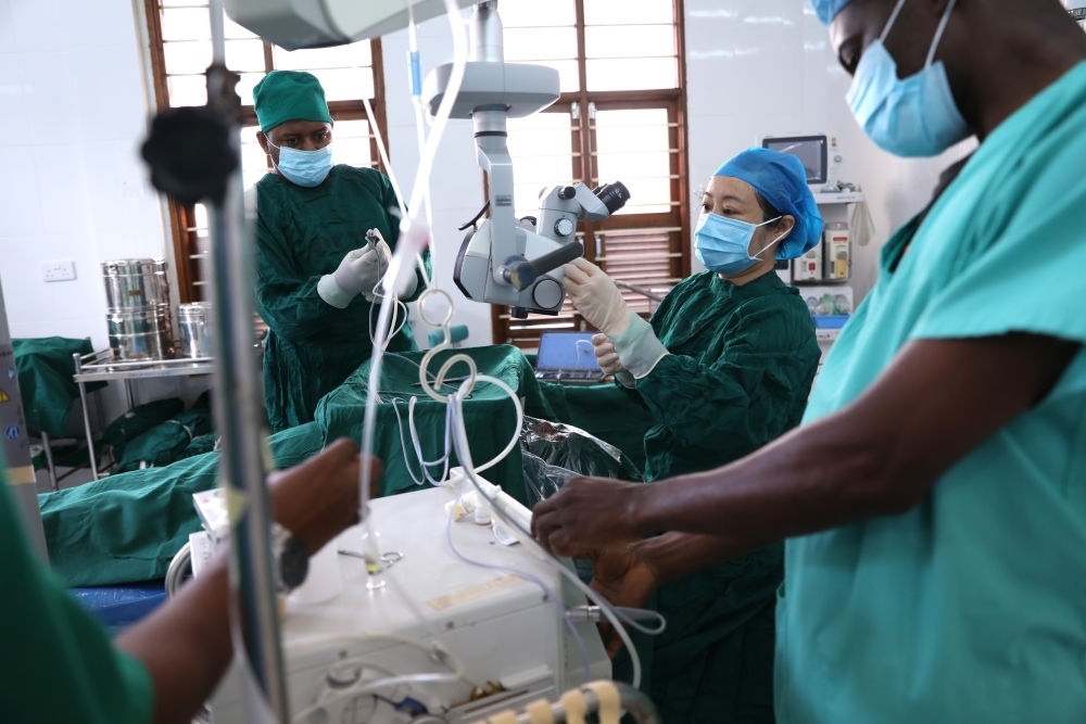2023年2月23日,在坦桑尼亞桑給巴爾島納茲莫加醫(yī)院,第32期中國援桑給巴爾醫(yī)療隊的眼科醫(yī)生董莉莉(右二)與桑給巴爾同事一起做術前準備。新華社記者 董江輝 攝