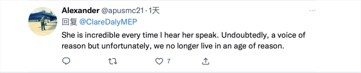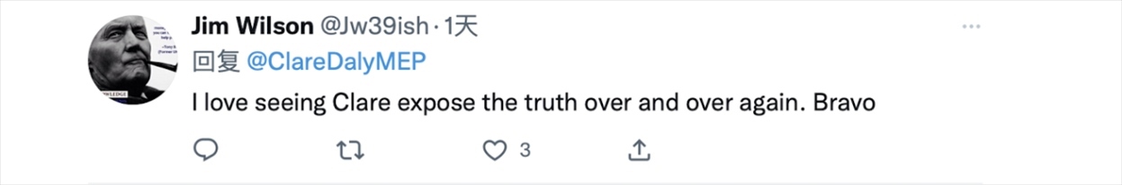 克萊爾·戴利的推文正是她在歐洲議會(huì)發(fā)言中所提到的內(nèi)容。在視頻中,克萊爾·戴利首先抨擊了西方對(duì)華問(wèn)題上的雙標(biāo)行為。她在發(fā)言時(shí)稱,“人們?cè)诒┞斗至训耐瑫r(shí)談?wù)撝鴪F(tuán)結(jié),他們一邊在歐盟向?yàn)蹩颂m提供武器,一邊與中國(guó)談?wù)摵推?。他們哀嘆中國(guó)在臺(tái)灣地區(qū)‘挑釁’,但對(duì)美國(guó)干涉國(guó)際公認(rèn)的中國(guó)領(lǐng)土卻只字未提?!?/p>