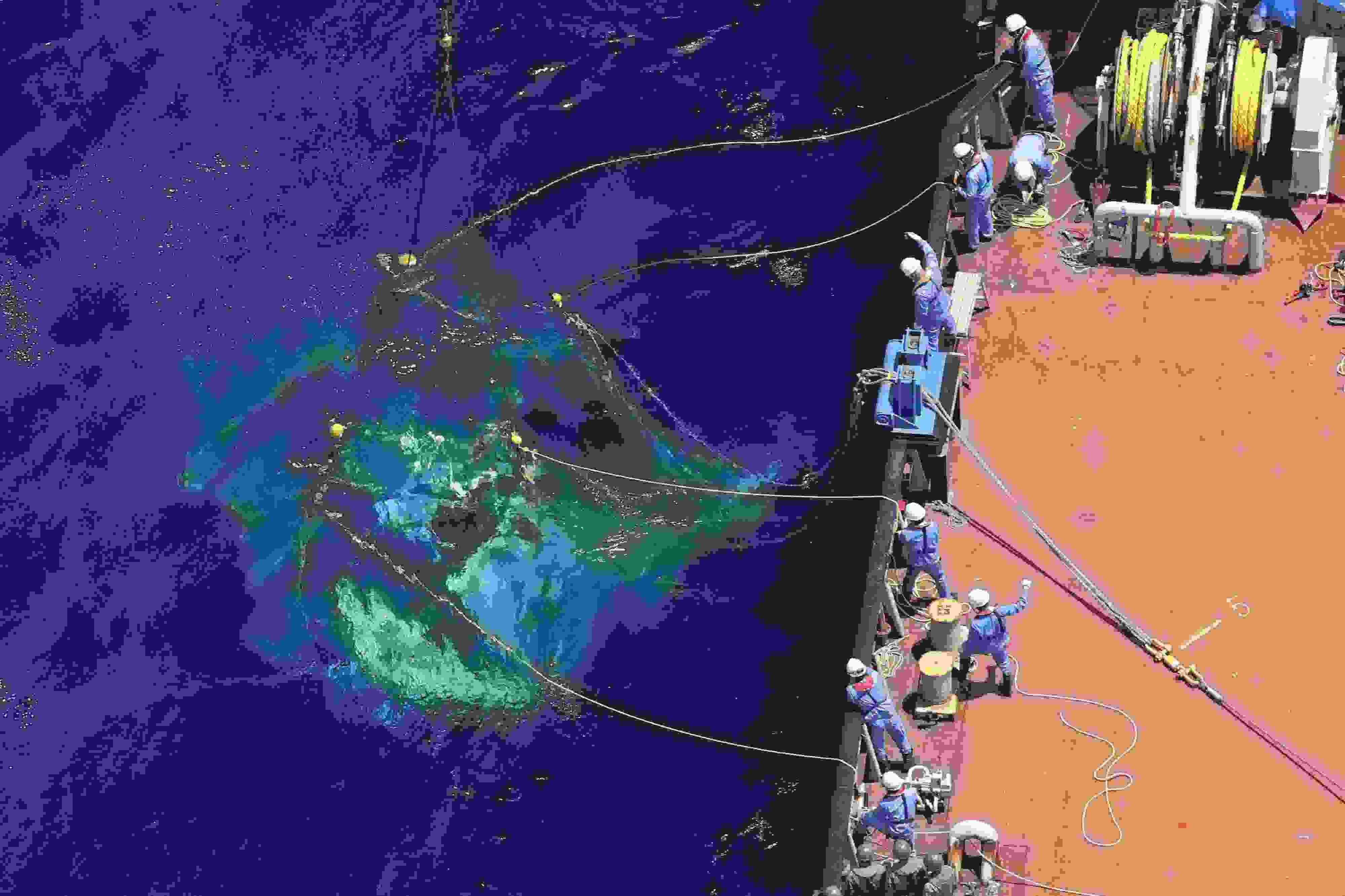 當(dāng)?shù)貢r(shí)間2023年5月2日,日本民間作業(yè)船于當(dāng)?shù)貢r(shí)間上午11時(shí)45分左右,將沖繩縣宮古島附近失事的日本自衛(wèi)隊(duì)直升機(jī)的機(jī)體打撈出海。據(jù)悉,一架日本陸上自衛(wèi)隊(duì)直升機(jī)4月6日在沖繩縣宮古島附近海域失聯(lián),失事直升機(jī)上共載有10人。 視覺(jué)中國(guó)