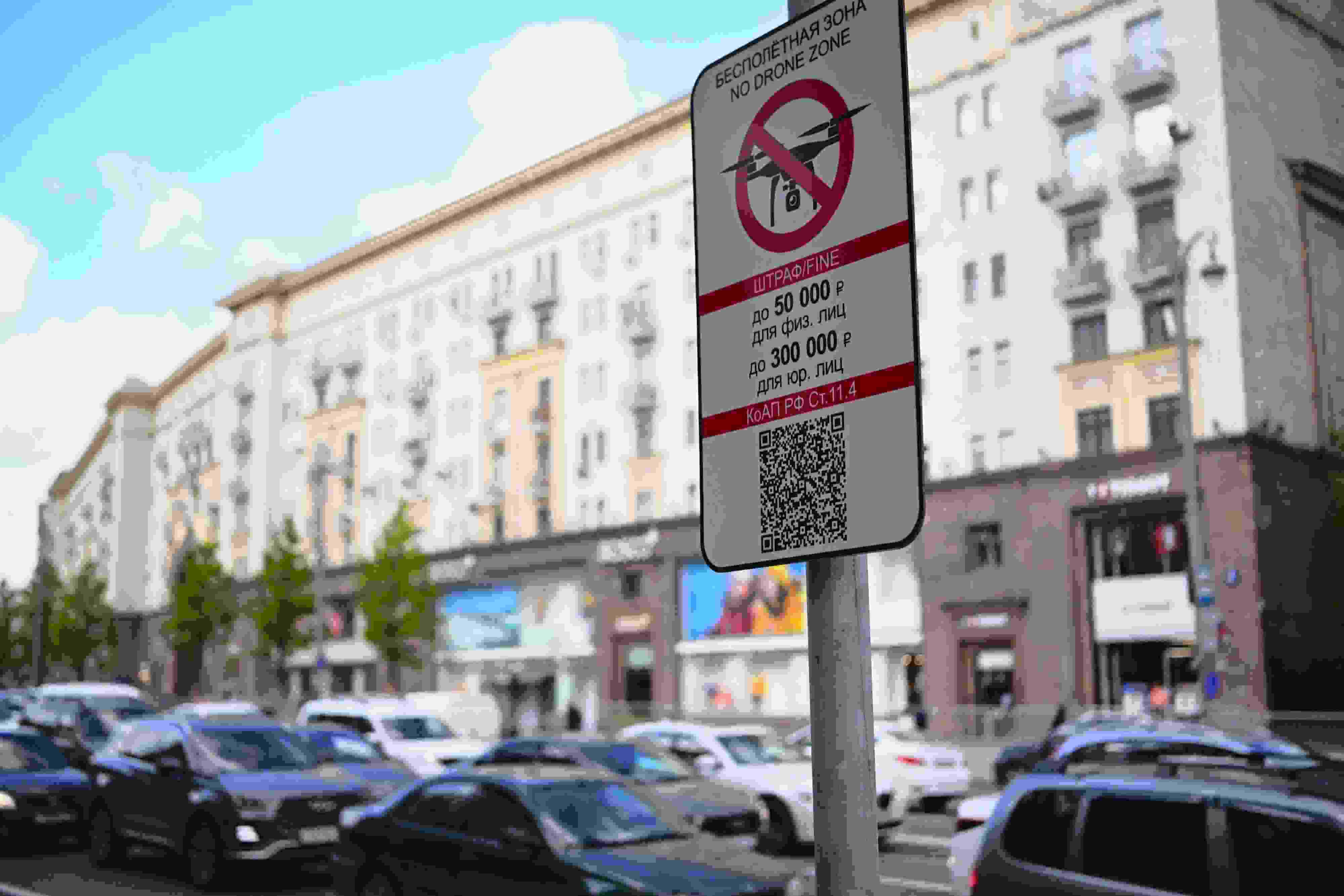 當(dāng)?shù)貢r間2023年5月3日,俄羅斯莫斯科,莫斯科市中心懸掛的“無人駕駛飛機(jī)禁飛區(qū)”的標(biāo)志,禁止無人機(jī)在該地區(qū)飛行??死锬妨謱m遭無人機(jī)襲擊后,莫斯科市長宣布禁止未經(jīng)授權(quán)的無人機(jī)在俄羅斯首都上空飛行。 視覺中國