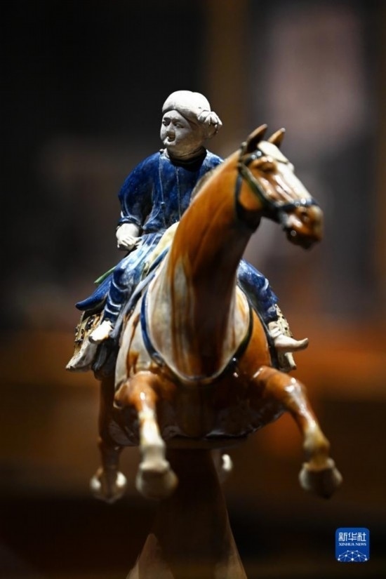 5月8日,游客在西安博物院參觀唐代三彩騰空馬。飛騰的三彩馬上騎有一胡俑,真實(shí)再現(xiàn)了絲綢之路上西域胡人急奔長安的生動(dòng)形象。
