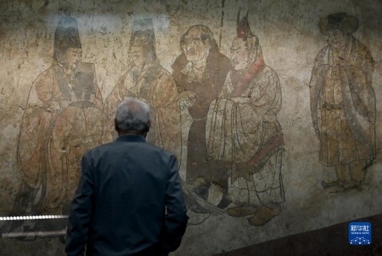 5月11日,游客在陜西歷史博物館內(nèi)觀看唐章懷太子墓《客使圖》?!犊褪箞D》描繪的是唐代外交機(jī)構(gòu)鴻臚寺官員接待外國使節(jié)的場(chǎng)景。