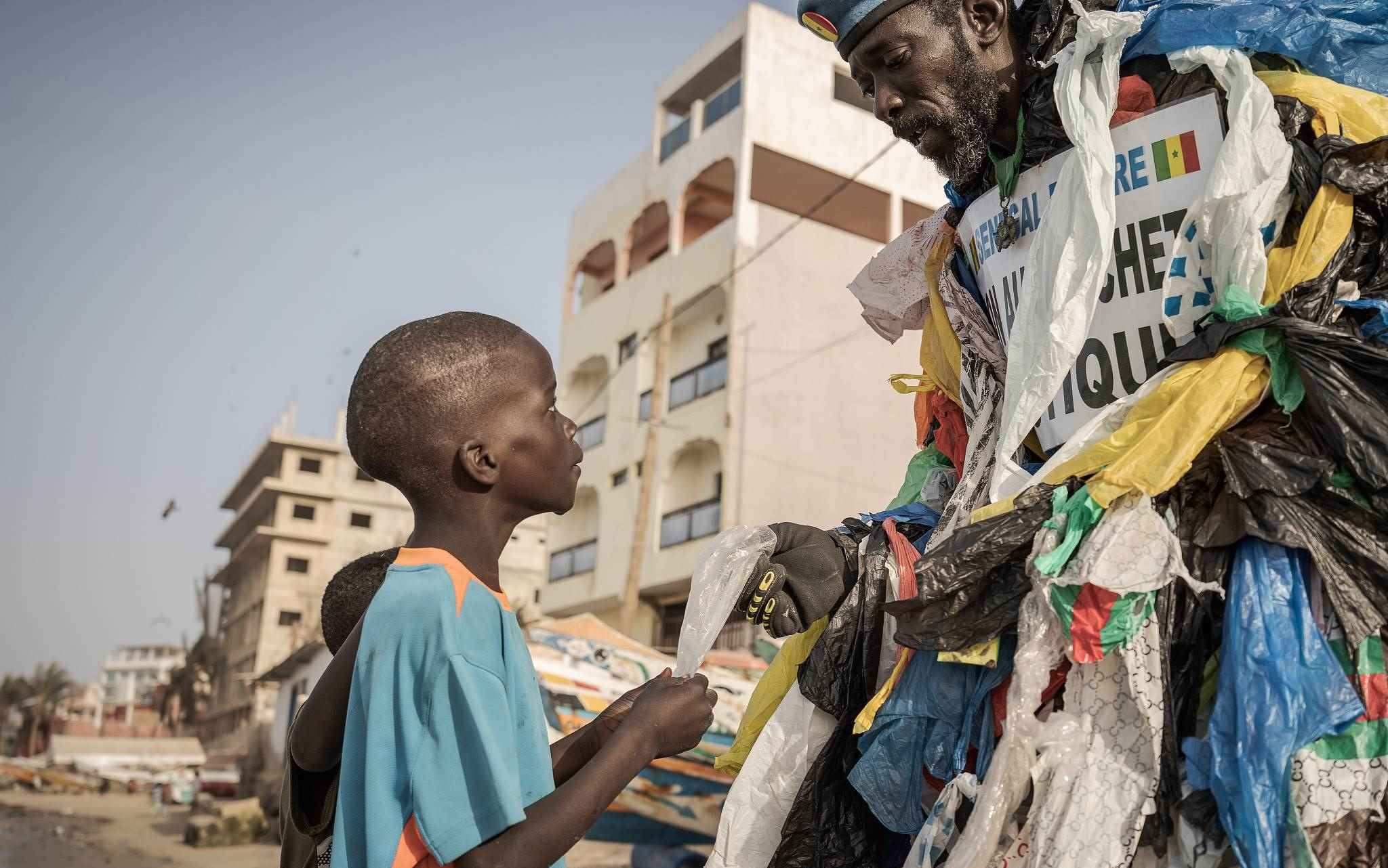 當?shù)貢r間2023年4月5日,塞內(nèi)加爾達喀爾,49歲的塞內(nèi)加爾環(huán)?;顒蛹夷拧し?,被稱為“塑料人”,和一個孩子在海灘上散步時拿著一個塑料包裝,提醒人們注意使用一次性塑料的污染。