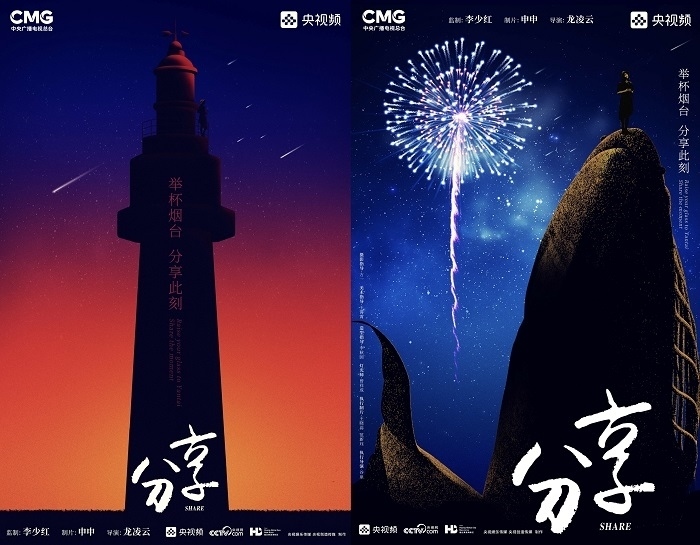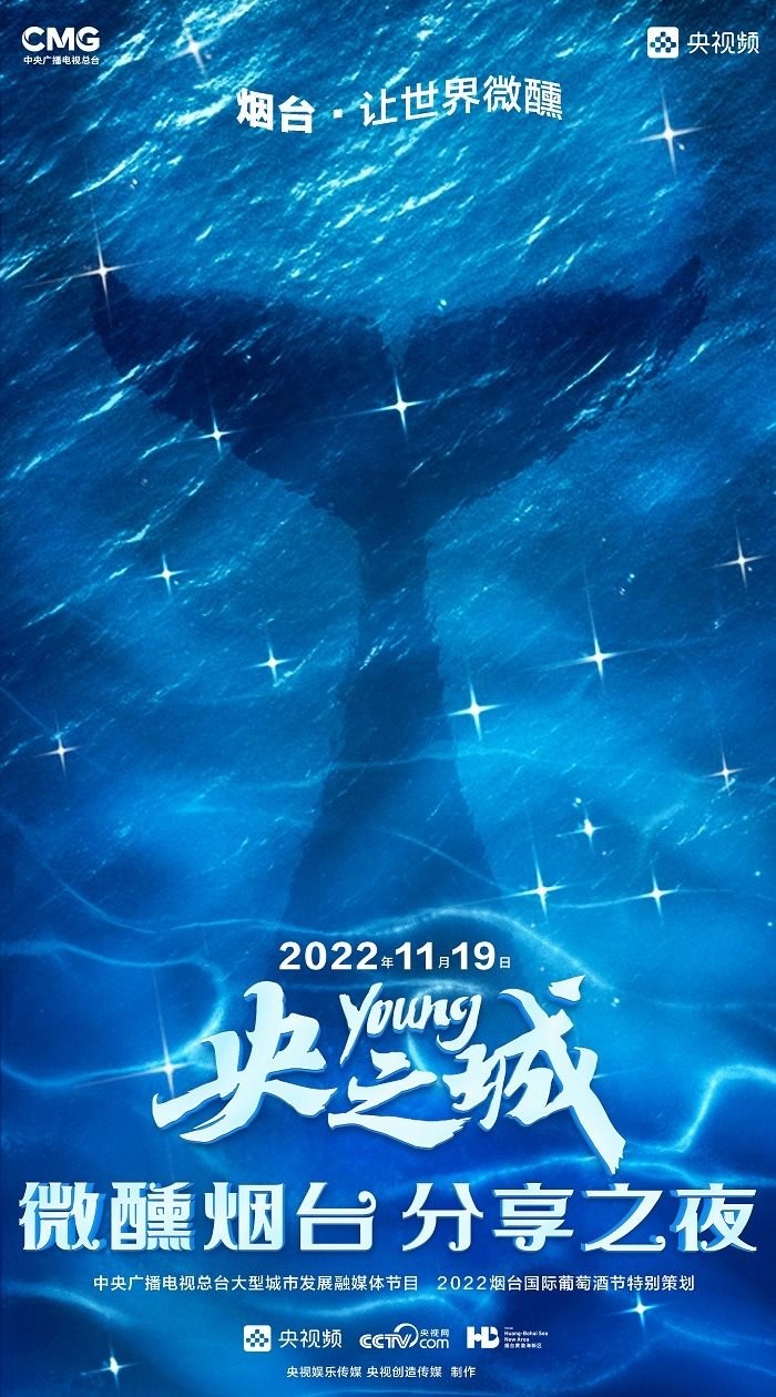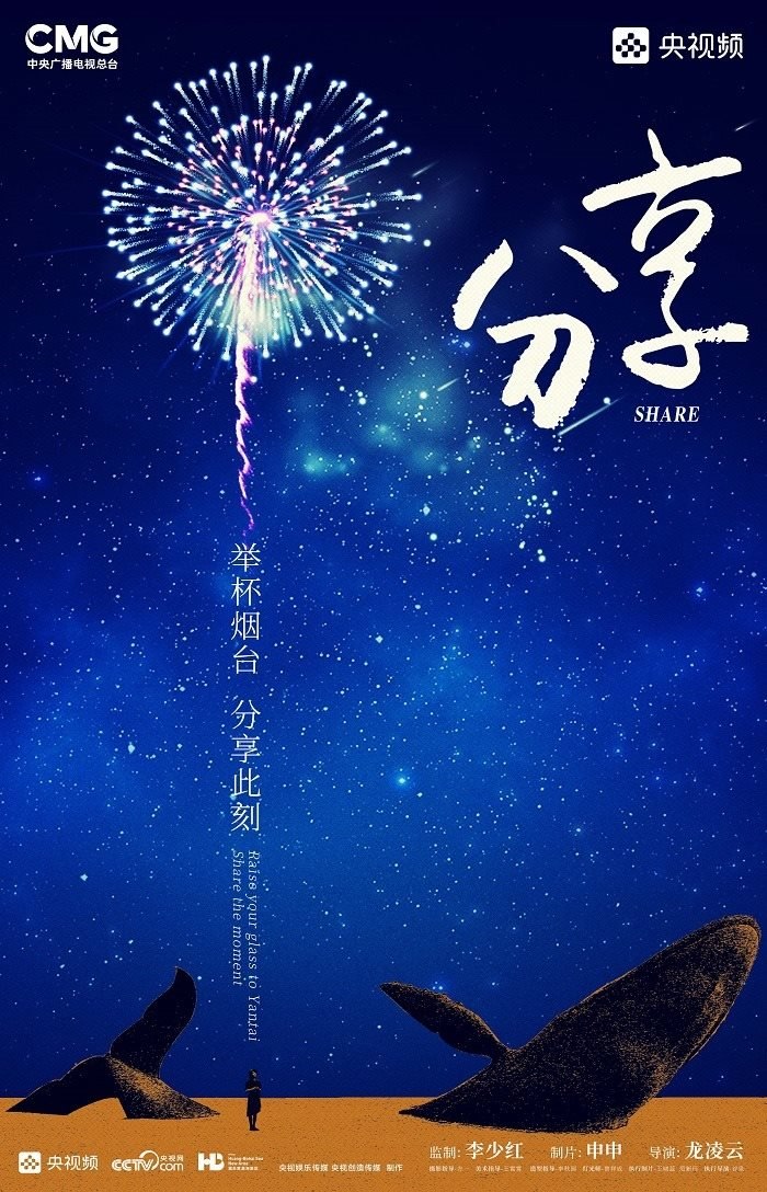 田雨峰在拍攝短片海報(bào)用圖的時(shí)候,首先確定了畫面中最突出的形象元素,同時(shí)也是交代短片故事發(fā)生地的地標(biāo)性雕塑——“孤獨(dú)的鯨“。這個(gè)雕塑如今是煙臺(tái)開發(fā)區(qū)金沙灘的網(wǎng)紅打卡地,網(wǎng)友為其起名”鯨落“。碩大的鯨魚從淺海處躍出海面,魚頭和魚尾凌空飛躍,其身體的一部分似藏在沙灘里。這是一個(gè)在真實(shí)生活中不會(huì)出現(xiàn)的景象,充滿了動(dòng)畫般的奇幻想象,位于煙臺(tái)碧藍(lán)的海邊,又天然地帶上了一點(diǎn)浪漫的色彩。短片中”舉杯煙臺(tái),分享此刻“的Slogan綴在尾聲,分享的正是煙臺(tái)這座城市獨(dú)有的沙灘、夜空、煙火和人間。短片中可以娓娓道來般逐漸交代,但在海報(bào)里,二環(huán)用畫面底部金色沙灘上”孤獨(dú)的鯨“,畫面上方如大海般湛藍(lán)的星空,星空中綻放的煙花,鎖定了地球上唯一的煙臺(tái)。田雨峰鏡頭中短片主角的人物照被二環(huán)拼貼到童話般色彩斑斕的畫面里,被著意縮小了的黑色小女孩于是成為一切奇幻、浪漫想象的迸發(fā)之源,和世界分享一個(gè)妙趣橫生的想法。
