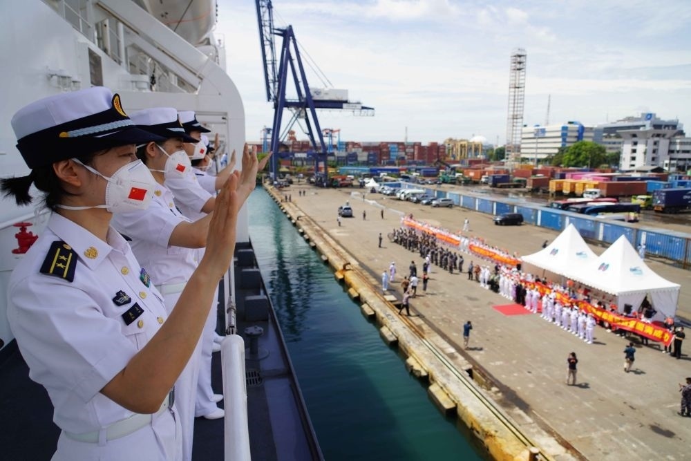2022年11月18日,在印度尼西亞首都雅加達(dá)的丹戎不碌港,中國(guó)海軍“和平方舟”號(hào)醫(yī)院船官兵向送行人員揮手告別。