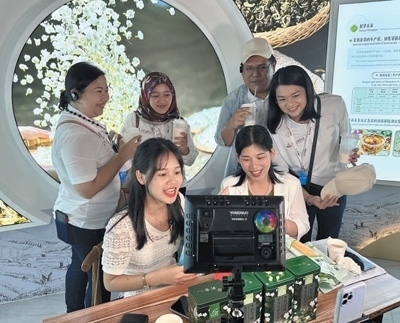 廣西橫州市茉莉花展館內(nèi),工作人員在直播展示茉莉花特色產(chǎn)品,東盟青年加入其中并向網(wǎng)友們問好。本報記者 戴楷然攝