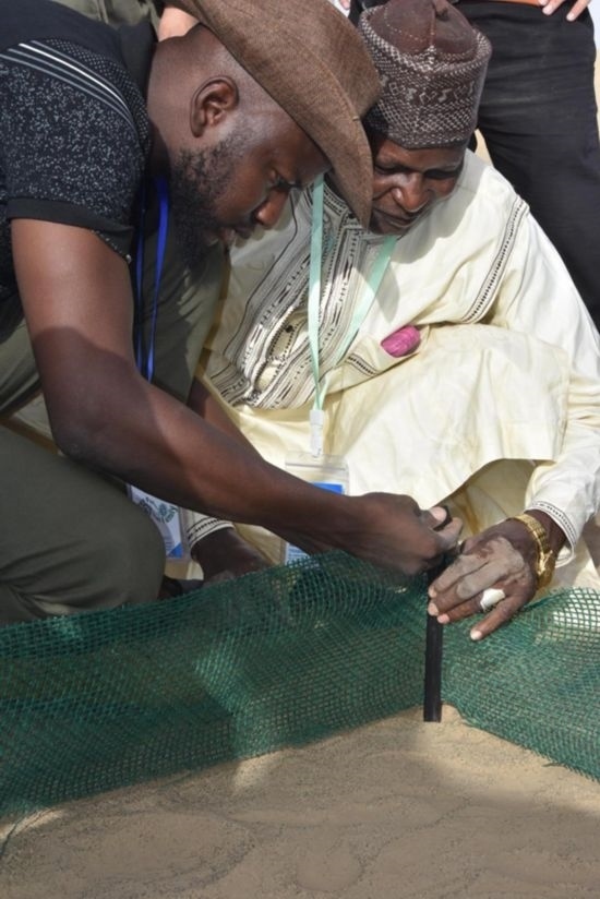 這位卡諾州環(huán)境部生態(tài)和林業(yè)主管按照中國專家的講授和示范,把條狀的可降解乳酸纖維沙袋灌滿沙子,擺成方格形狀,又拿起沉甸甸的鐵錘,把小樁子敲進沙地里,圍上高密度固沙網。