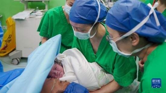 中國海軍“和平方舟”號醫(yī)院船執(zhí)行“和諧使命-2023”任務(wù)中的第3名“和平寶寶”在東帝汶誕生,新生兒與母親第一次見面(9月5日攝)。新華社發(fā)(李珂嘉賀 攝)
