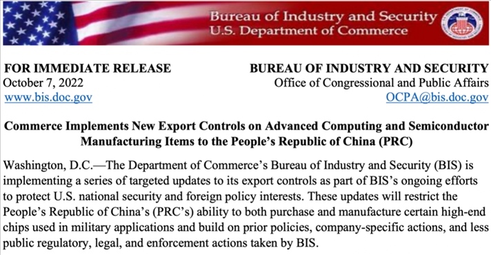 2022年10月7日,美國(guó)商務(wù)部工業(yè)和安全局發(fā)布半導(dǎo)體出口管制新規(guī)。圖源:美國(guó)商務(wù)部網(wǎng)站