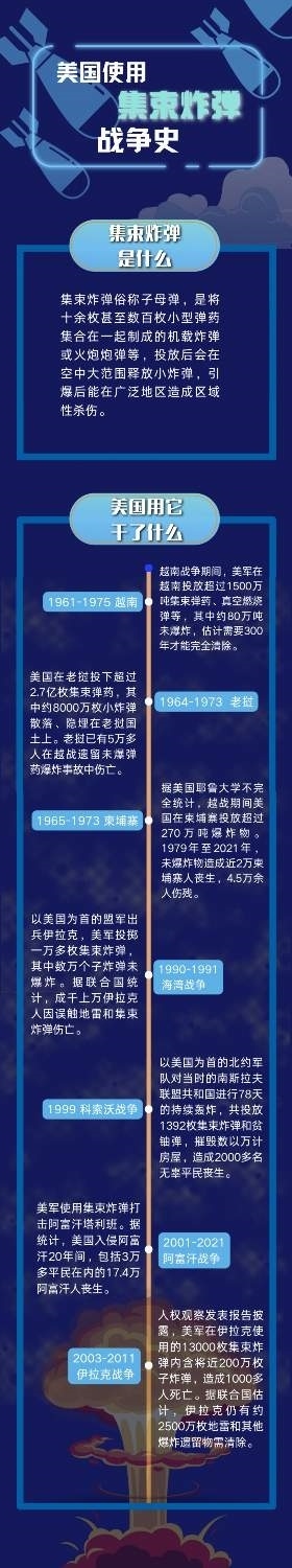 集束彈藥比普通彈藥殺傷力更強(qiáng)、造成平民傷亡可能性更大。美國空軍曾經(jīng)在越南戰(zhàn)爭、海灣戰(zhàn)爭、伊拉克戰(zhàn)爭等戰(zhàn)事中大量使用集束炸彈,給這些國家民眾及子孫后代帶來無法磨滅的傷痛。