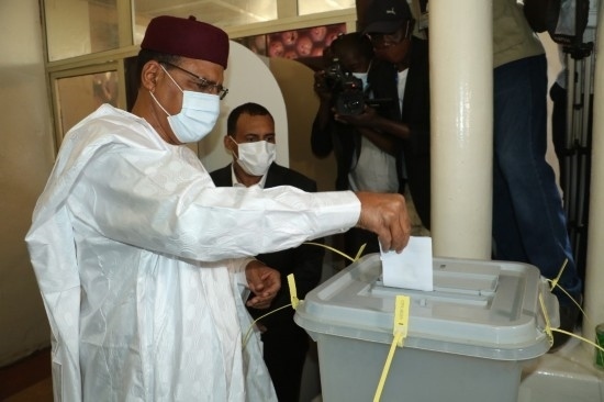2021年2月21日,尼日爾爭(zhēng)取民主和社會(huì)主義黨候選人穆罕默德·巴祖姆(前)在尼亞美的一處投票站投票。新華社發(fā)