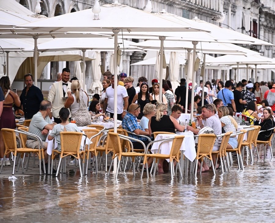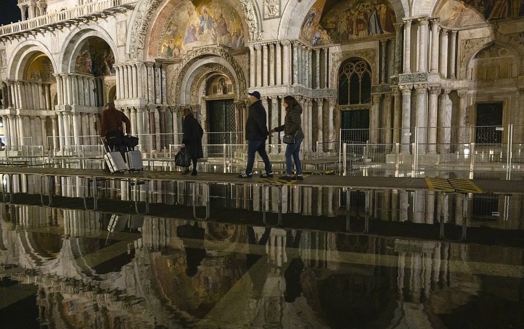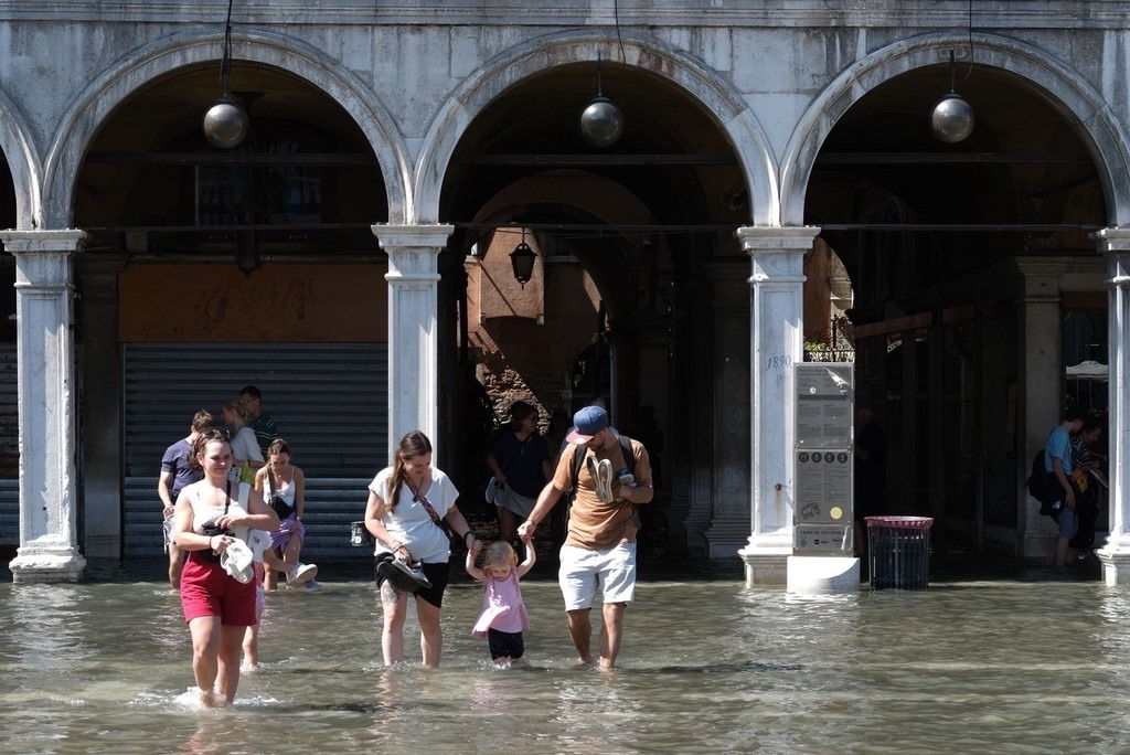 威尼斯水位上漲,游客在積水中觀光,城市面臨破壞風險
