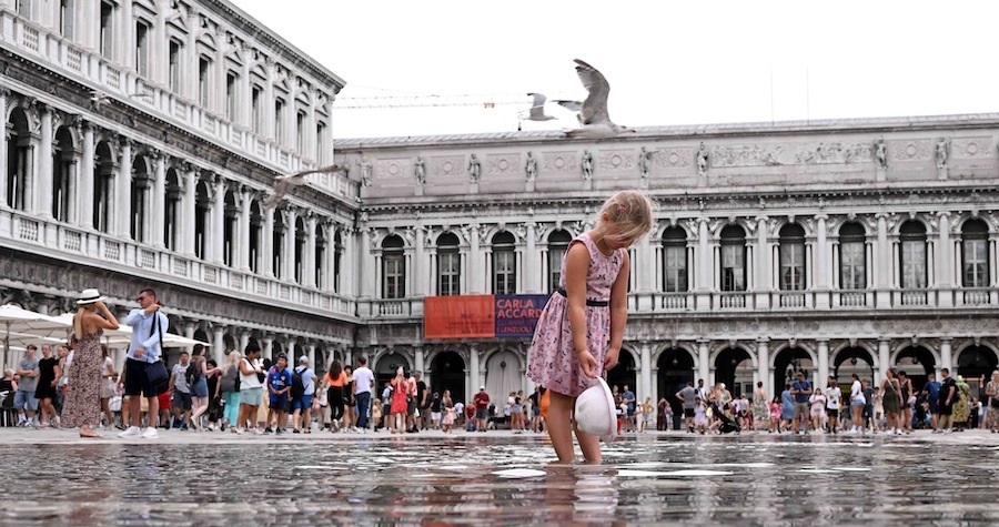 當?shù)貢r間2023年8月4日,意大利威尼斯,兒童在積水中玩耍。